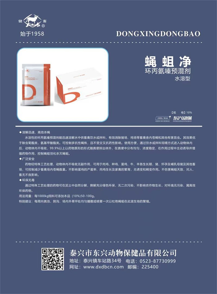 水溶性的環(huán)丙氨嗪預(yù)混劑能迅速溶解水中供畜禽飲水或拌料,有效消除豬場、雞場等畜禽舍內(nèi)蒼蠅和其他有害昆蟲。其效果優(yōu)于除蟲菊酯類,氨基甲酸酯類?煽刂贫嗫剐韵壷,且不受交叉抗藥性影響。使用方便,通過飲水或拌料飼喂方式進(jìn)入動物體內(nèi)后,動物體內(nèi)不吸收,99.9%以上以藥物原形的形式隨糞便排出體外,在糞便中分布均勻,濃度穩(wěn)定,在作用過程中主動誘導(dǎo)并增強(qiáng)藥物作用,控制蠅蛆羽化殺滅蠅蛆。